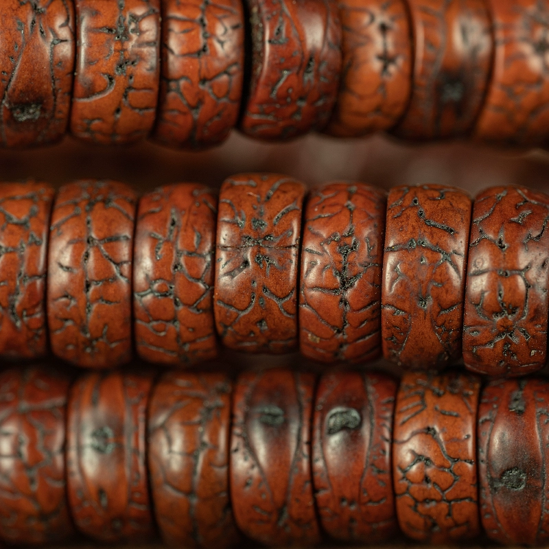 - 歳月の跡: 表面的には数十年かけて遊んでいる。 けいせいダークブラウンレッド。 琥珀のようにつやつやしている。 部分的に見える自然開片 (チベット語 「うろこ状の物」 ) 。 毛糸のように細い紋様。 縁が丸くとげがない。 長期油脂浸透と空気酸化の結果。