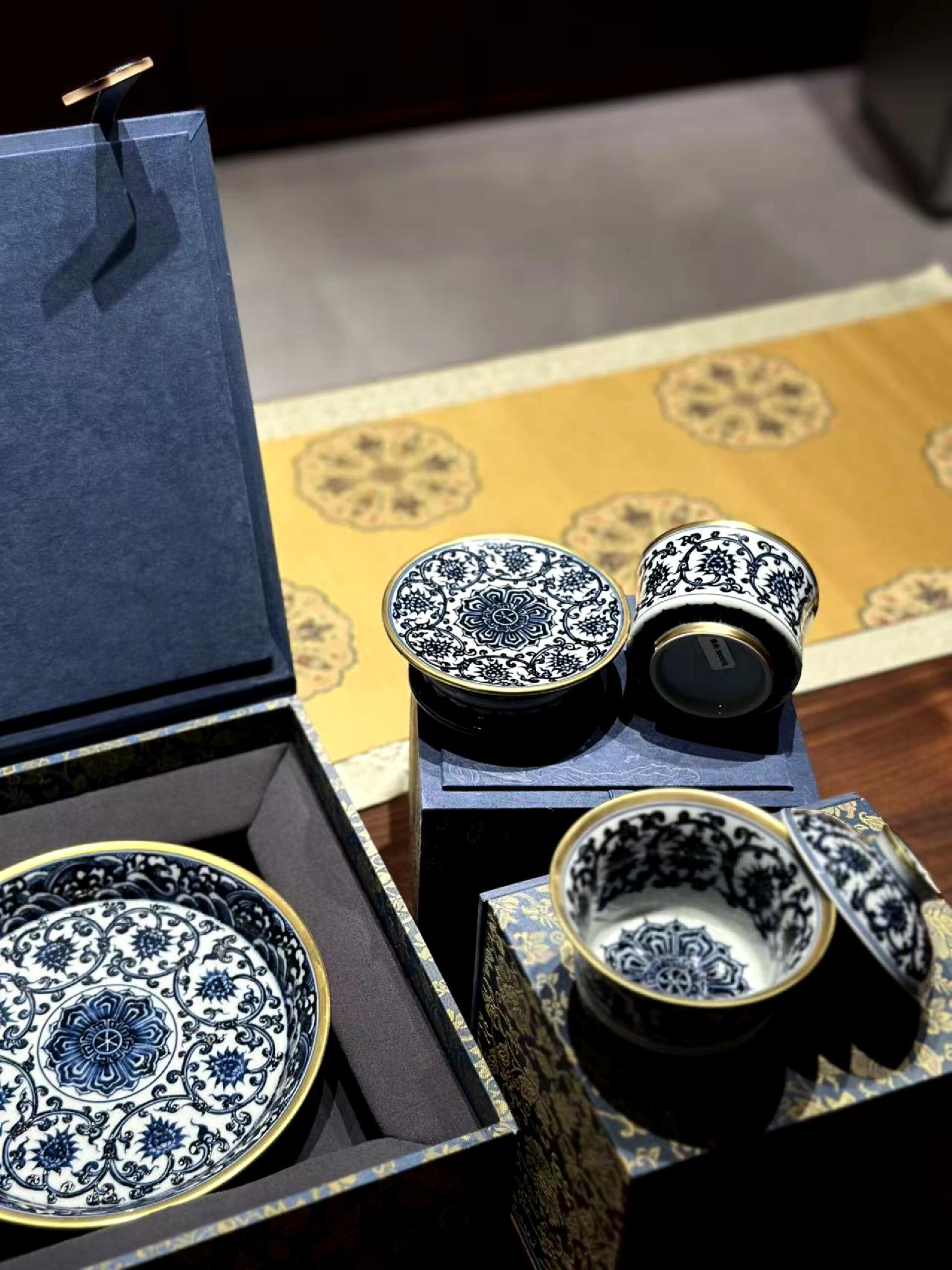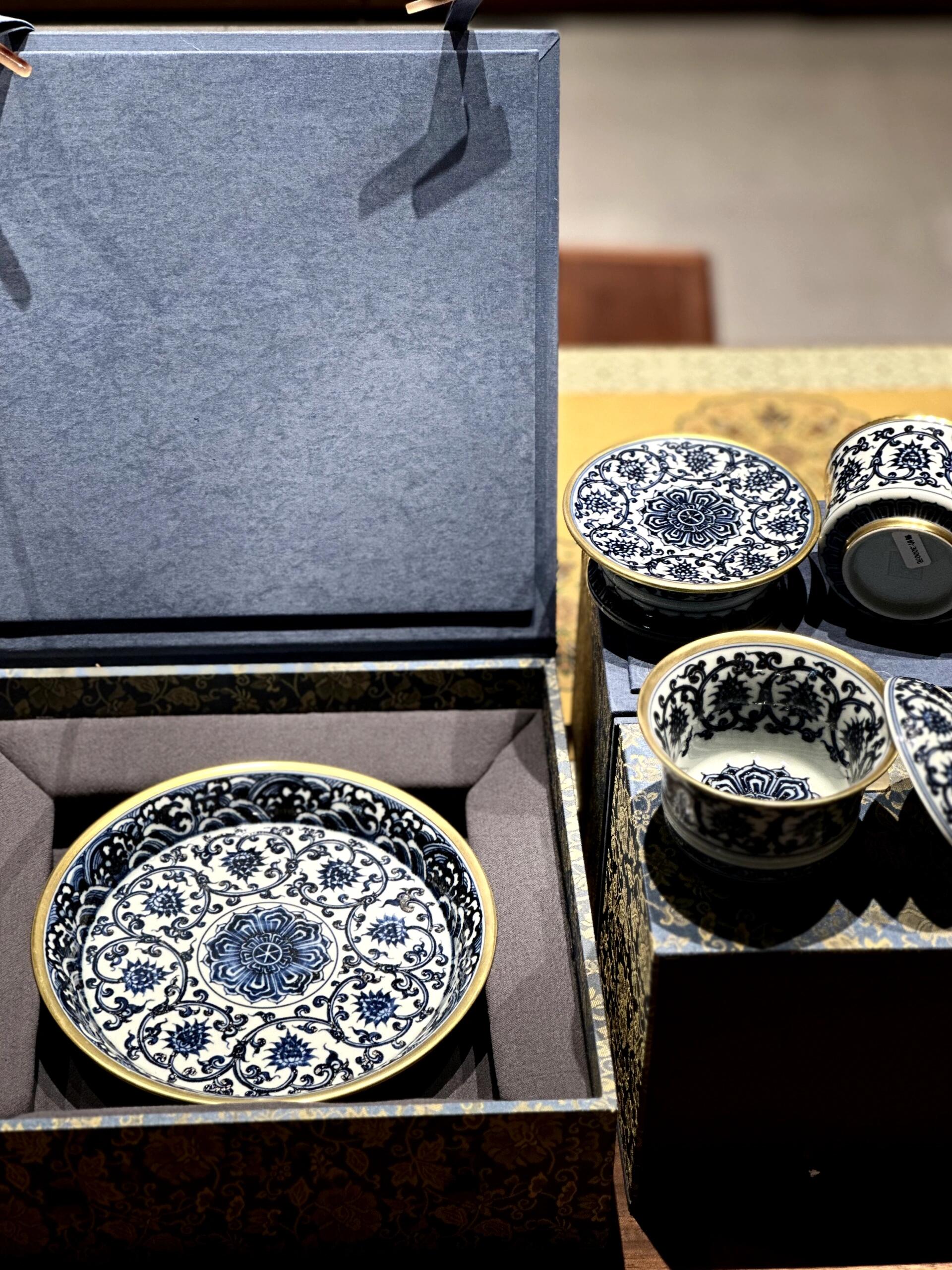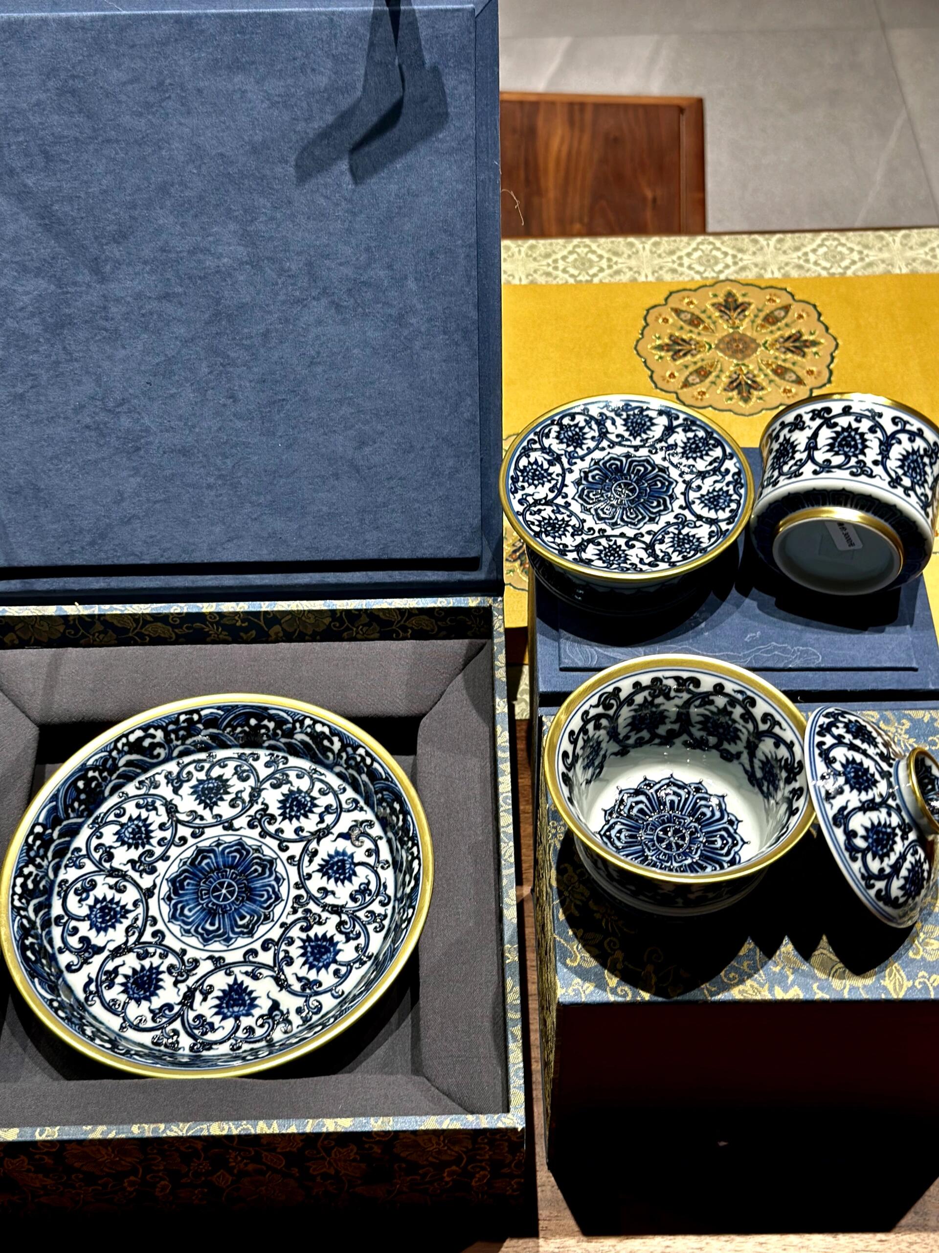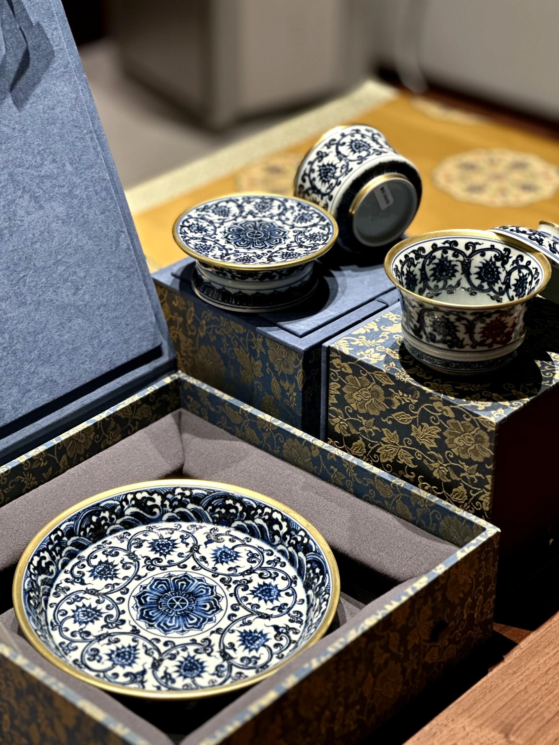 本セットの核心は、純手工による青花描きと金彩装飾にあります。青花は伝統的なコバルト原料を使用し、陶芸家の熟練した技によって、白い胎地の上に緻密な線条で纏枝蓮文を描かれます。焼成後の青花は鮮やかなサファイア色を呈し、線条は柔らかく力強く、水墨画のような雰囲気を醸し出しています。その上に、純金を原料とした金彩を細かく描き加え、青花の清雅を引き立てつつ、高貴な光沢を添え、「錦上添花」の芸術的効果を実現しています。