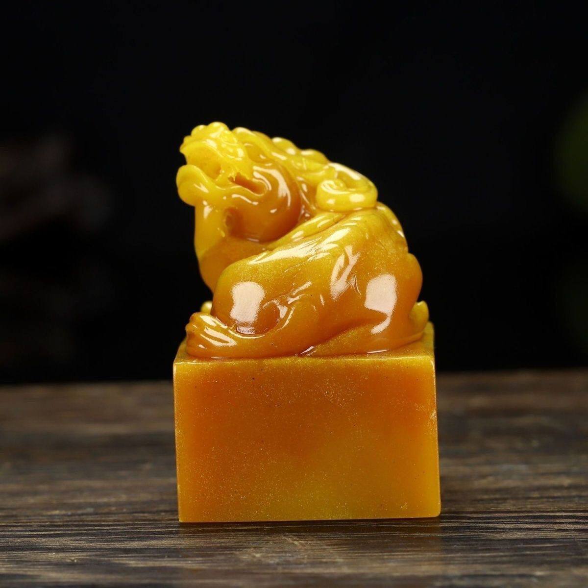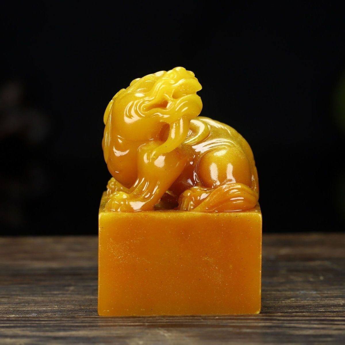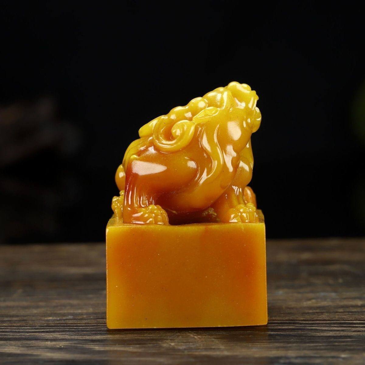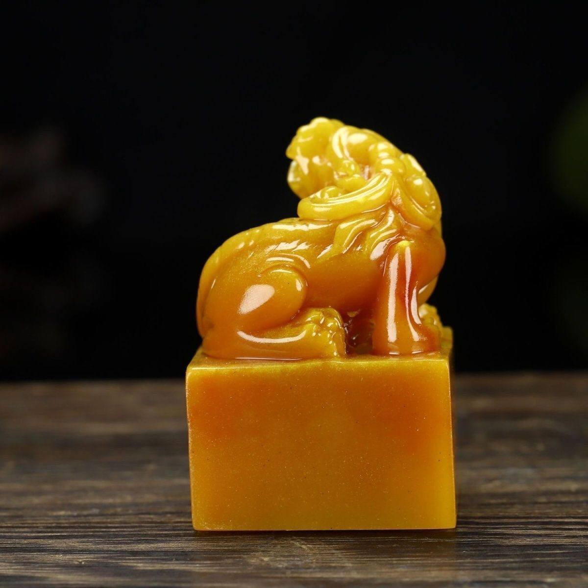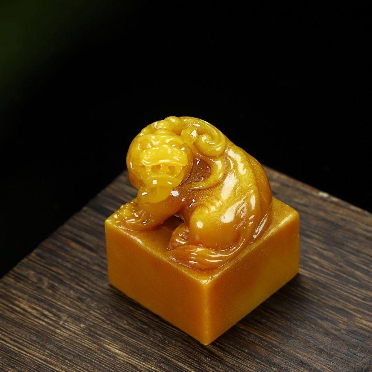 田黄石は「石の中の皇帝」と称えられ、福建省寿山にて長い年月をかけて誕生する希少品です。本作品は 2005 年に制作された逸品で、瑞獣・貔貅を繊細かつ雄々しく彫刻しております。